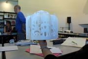 Arno a expliqué sa démarche de création ; elle comporte plusieurs étapes : travail de recherche, étude de faisabilité (maquette en blanc), travail de vérification (croquis, positionnement du texte et des trous) ; puis il a présenté aux bénévoles plusieurs de ces livres pop-up : Panic city : livre atelier pop-up (Editions les Apprentis rêveurs), Un tout petit point : livre-carrousel à construire (Les Apprentis rêveurs). Il a rappelé à cette occasion que le pop-up sert une narration, un propos.