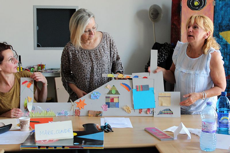 En groupes, les participantes ont réalisé plusieurs créations à la manière de Katsumi Komagata, Louise-Marie Cumont, Hervé Tullet, à partir de cartons, de chutes et de feuilles de papier colorées, de petits morceaux de tissu. Ces créations peuvent ensuite être utilisées avec des enfants, les plus jeunes notamment, sans crainte quant à la question de la manipulation par de petites mains !